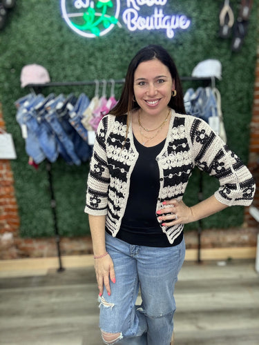 POL Crochet Flower Button Down Cardigan - Natural/Black