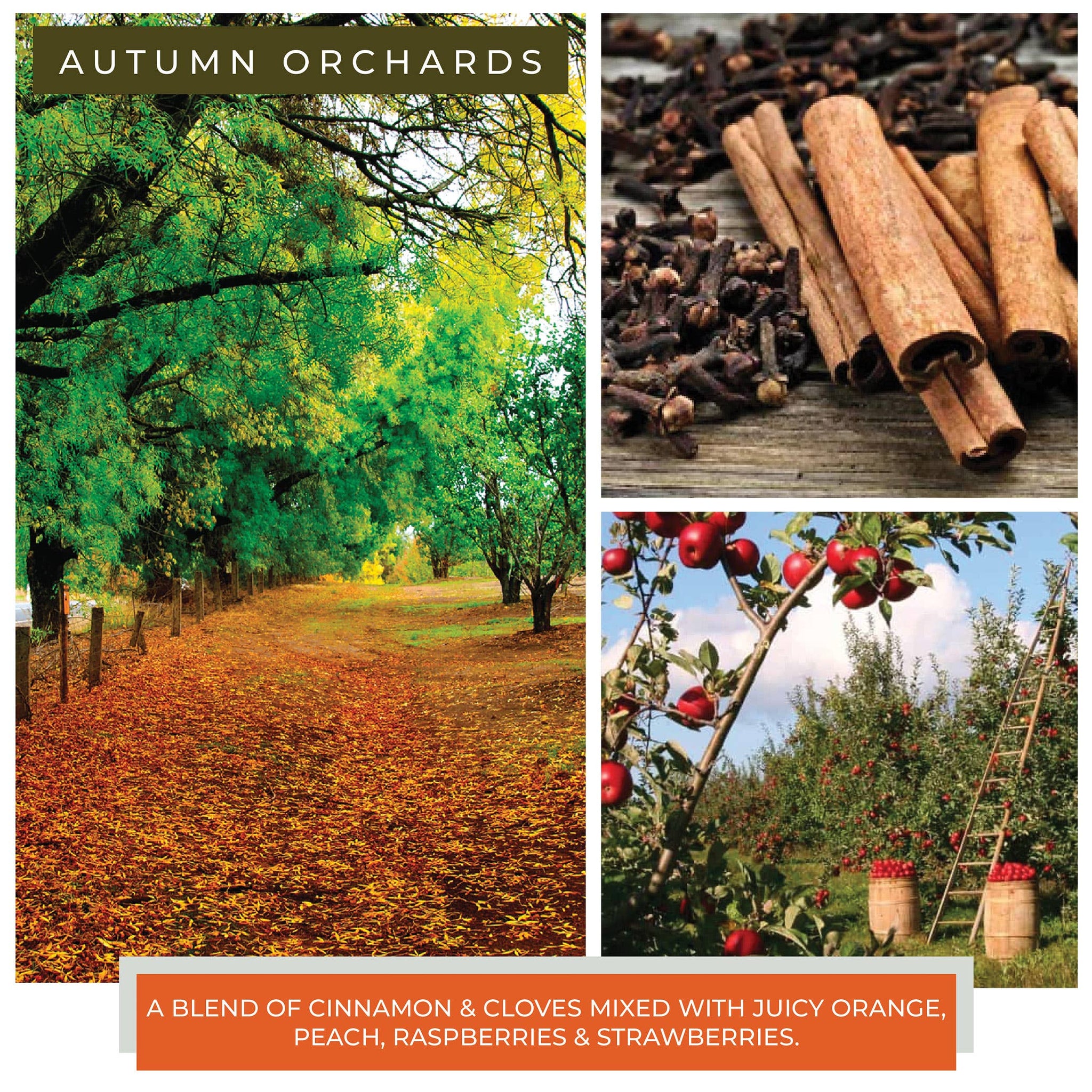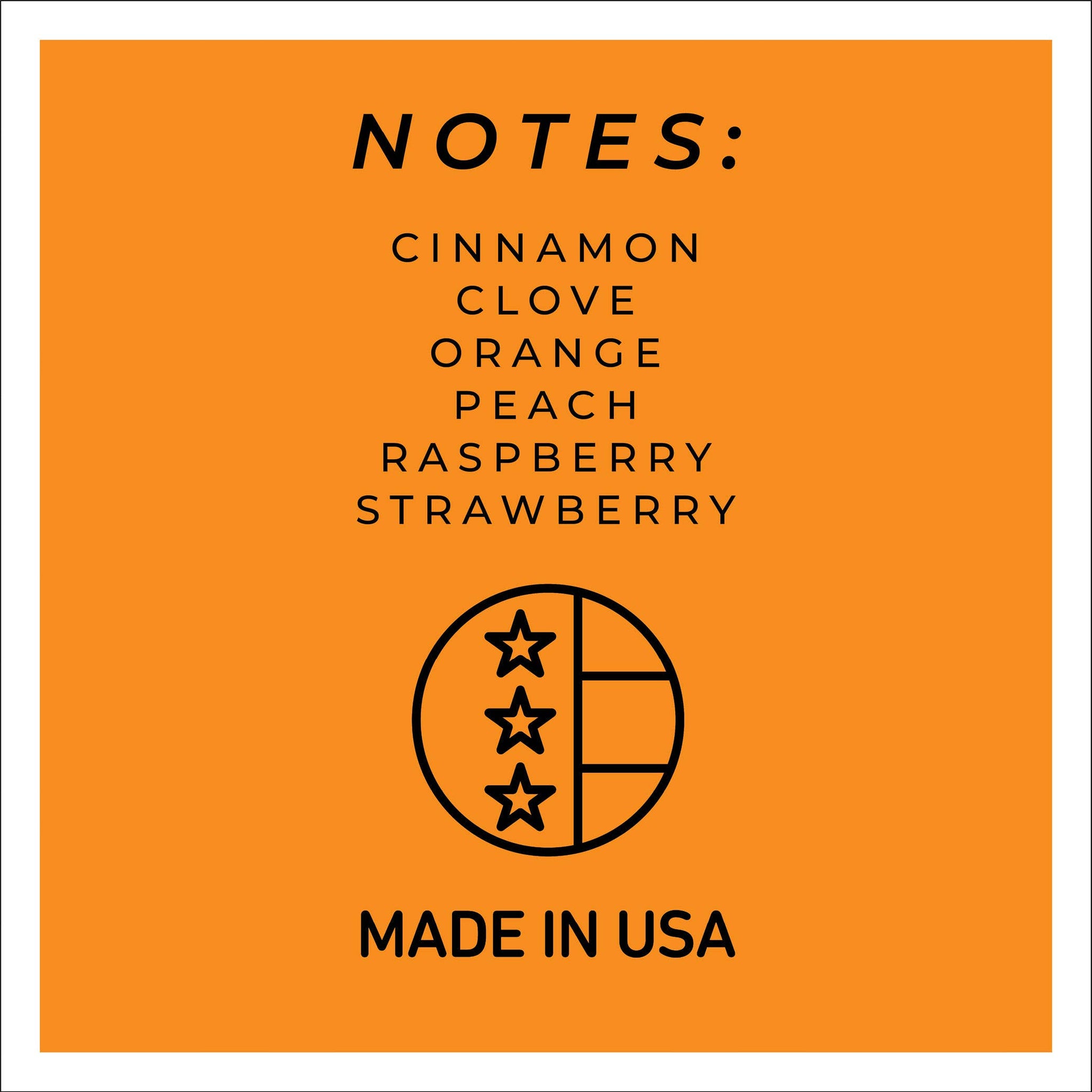 A blend of cinnamon & cloves mixed with juicy orange, peach, raspberries & strawberries. 6oz / Single Wick / Burn Time: 30 hours Dimension: 2.5"w x 3.25h Available options: Black Lid or Copper Lid