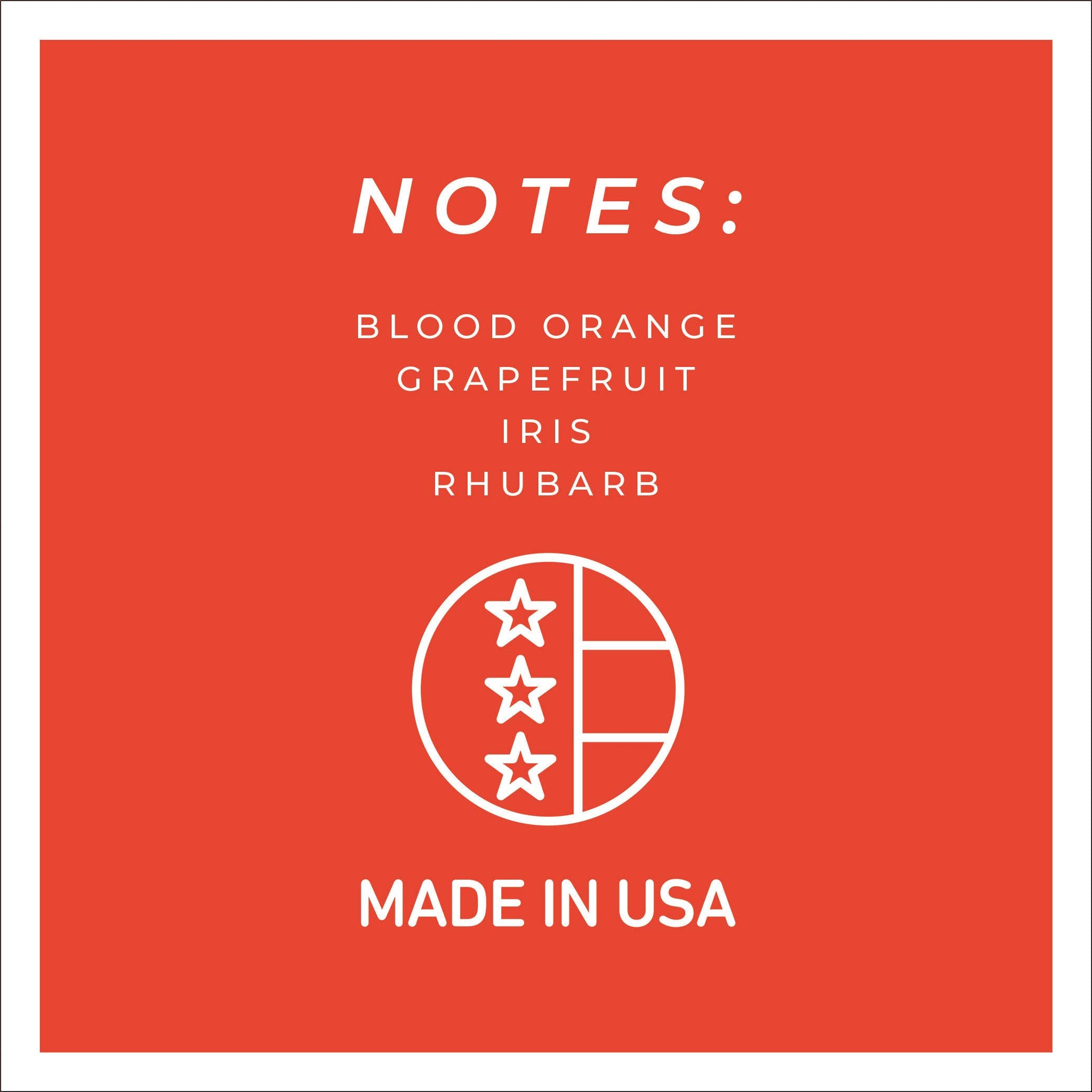 Bright, tangy blood orange combined with zesty grapefuit, rhubarb and a hint of iris. 6oz / Single Wick / Burn Time: 30 hours Dimension: 2.5"w x 3.25h Available options: Black Lid or Copper Lid