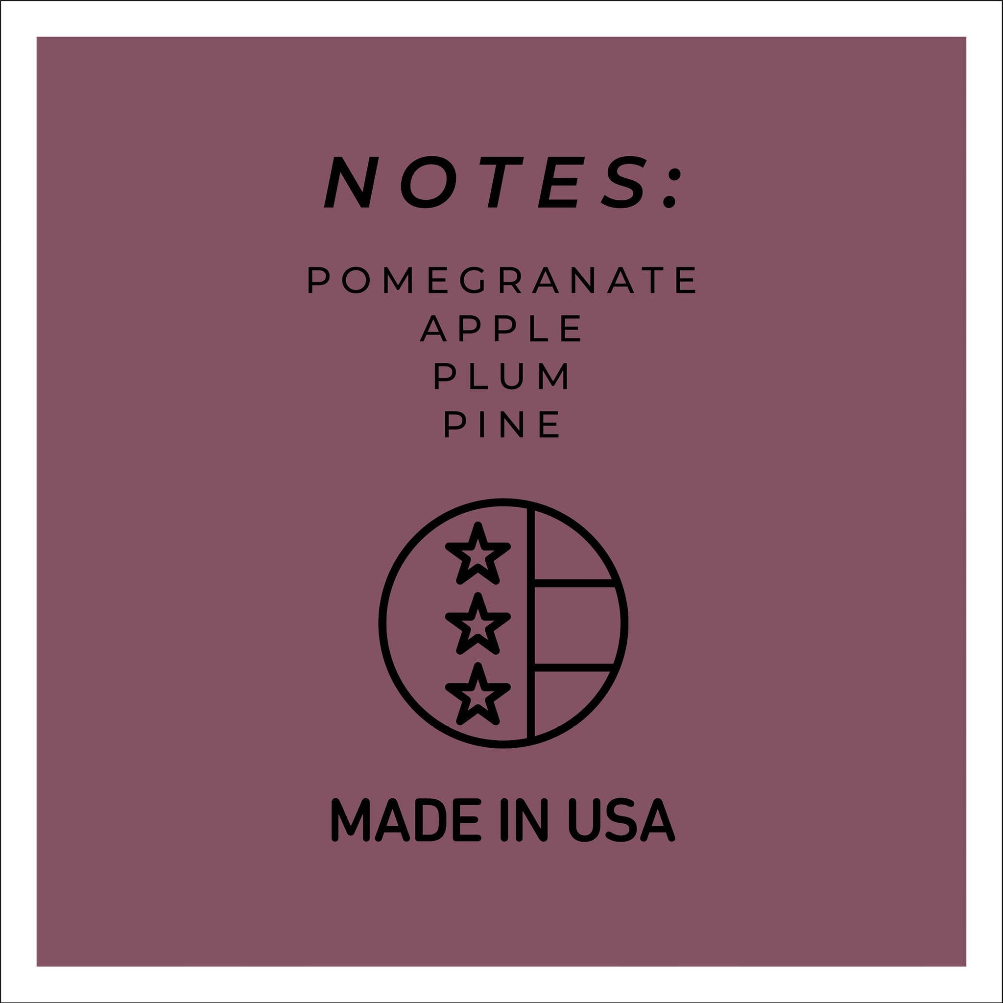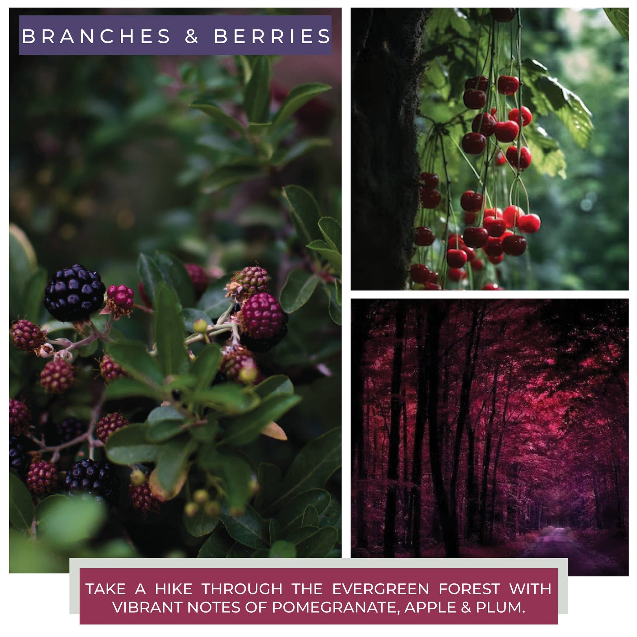 Take a hike through the evergreen forest with vibrant notes of pomegranate, apple & plum. 6oz / Single Wick / Burn Time: 30 hours Dimension: 2.5"w x 3.25h Available options: Black Lid or Copper Lid