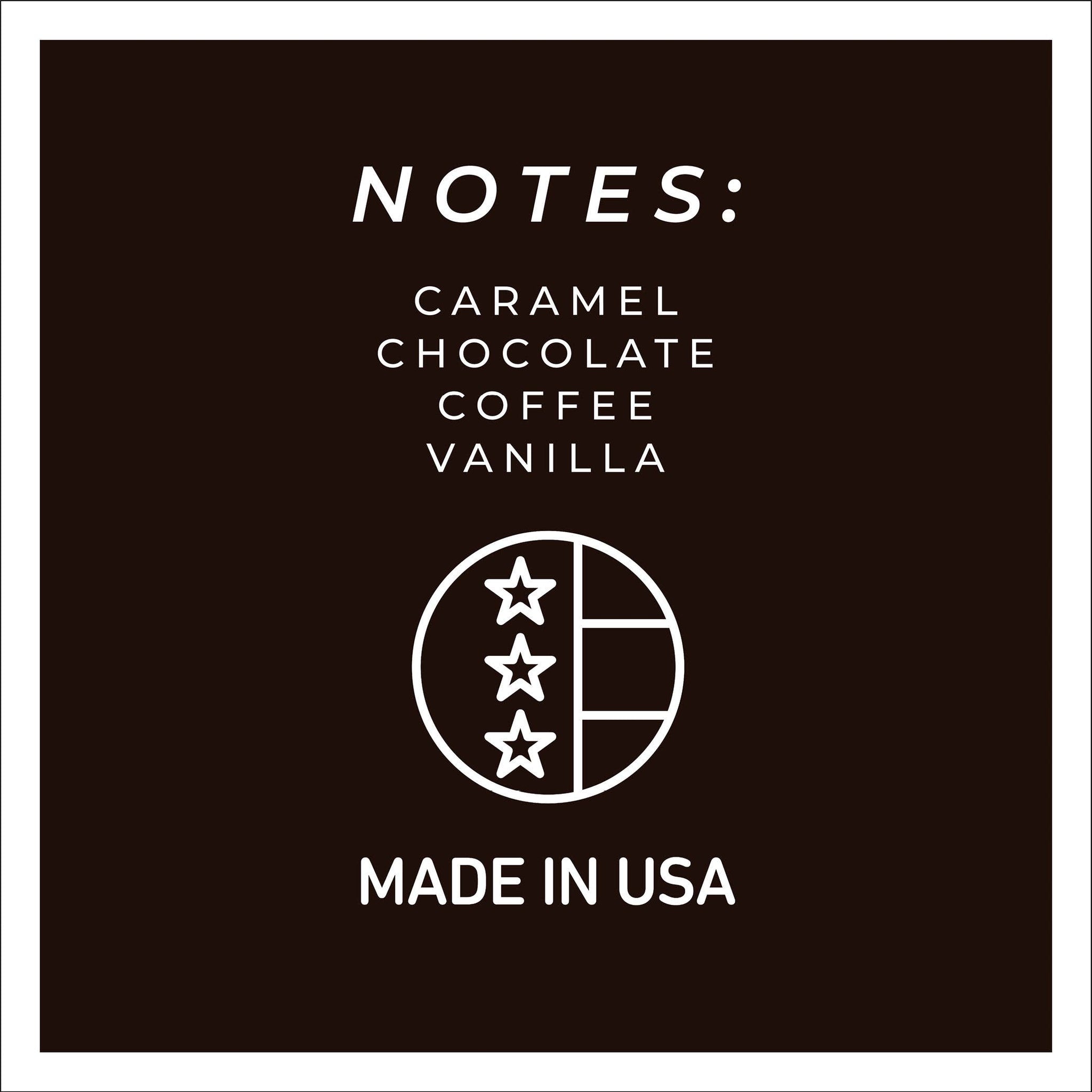 Fresh brewed coffee, cocoa beans, creamy vanilla & sweet caramel. 6oz / Single Wick / Burn Time: 30 hours Dimension: 2.5"w x 3.25h Available options: Black Lid or Copper Lid