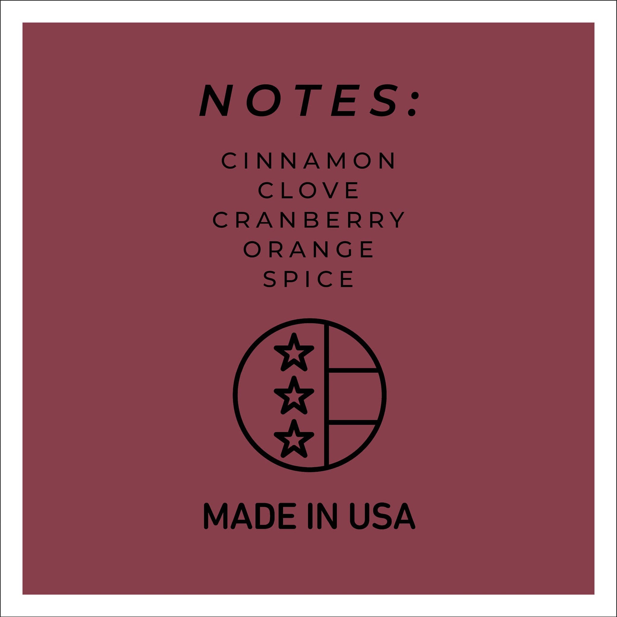 Rich cranberry, sweet orange mixed with spicy cinnamon & clove. 6oz / Single Wick / Burn Time: 30 hours Dimension: 2.5"w x 3.25h Available options: Black Lid or Copper Lid