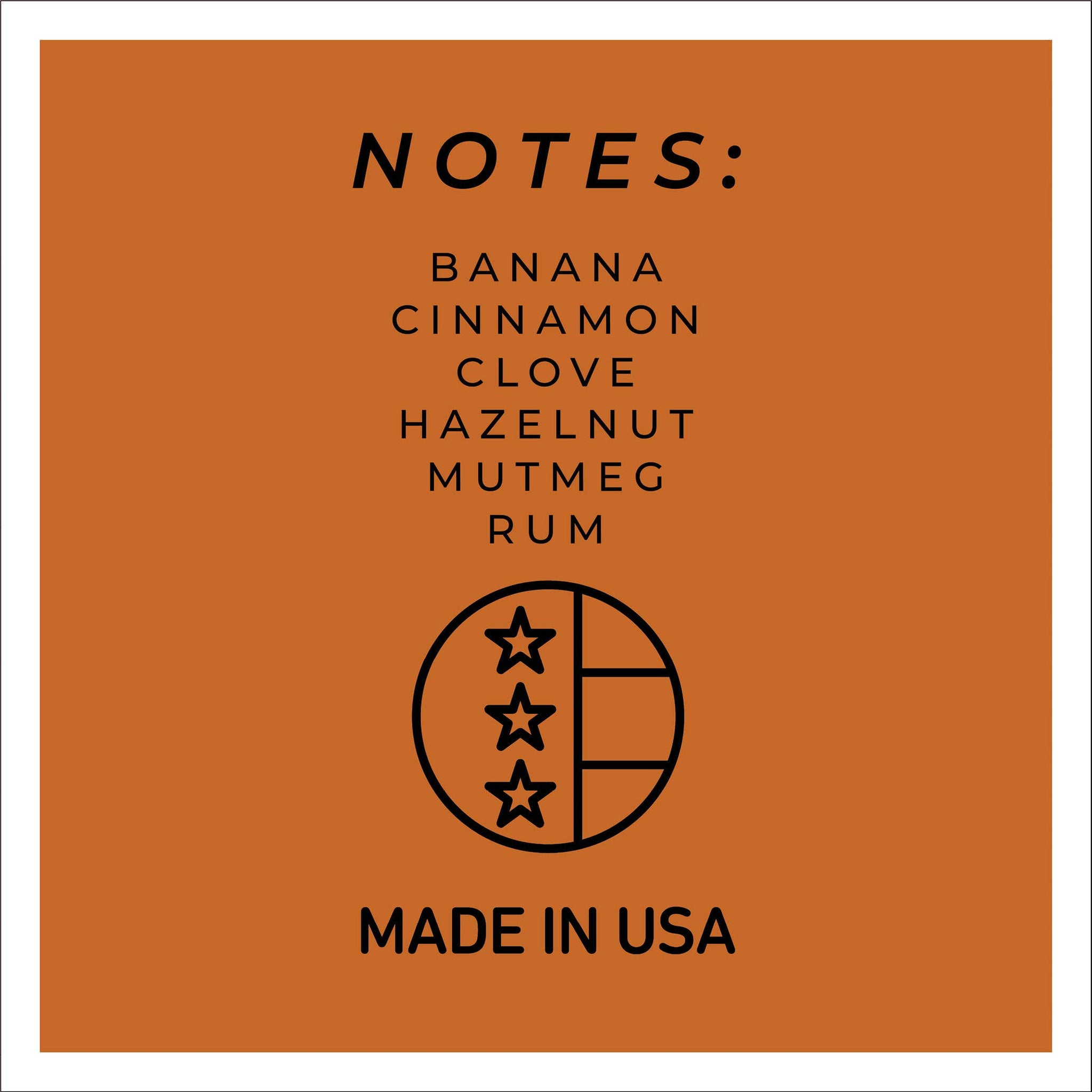 An enticing blend of banana rum, cinnamon, clove, nutmeg & hazelnut. 22oz / Double Wick / Burn Time: 125 hours Dimension: 4.”75w x 4h Available options: Black Lid or Copper Lid