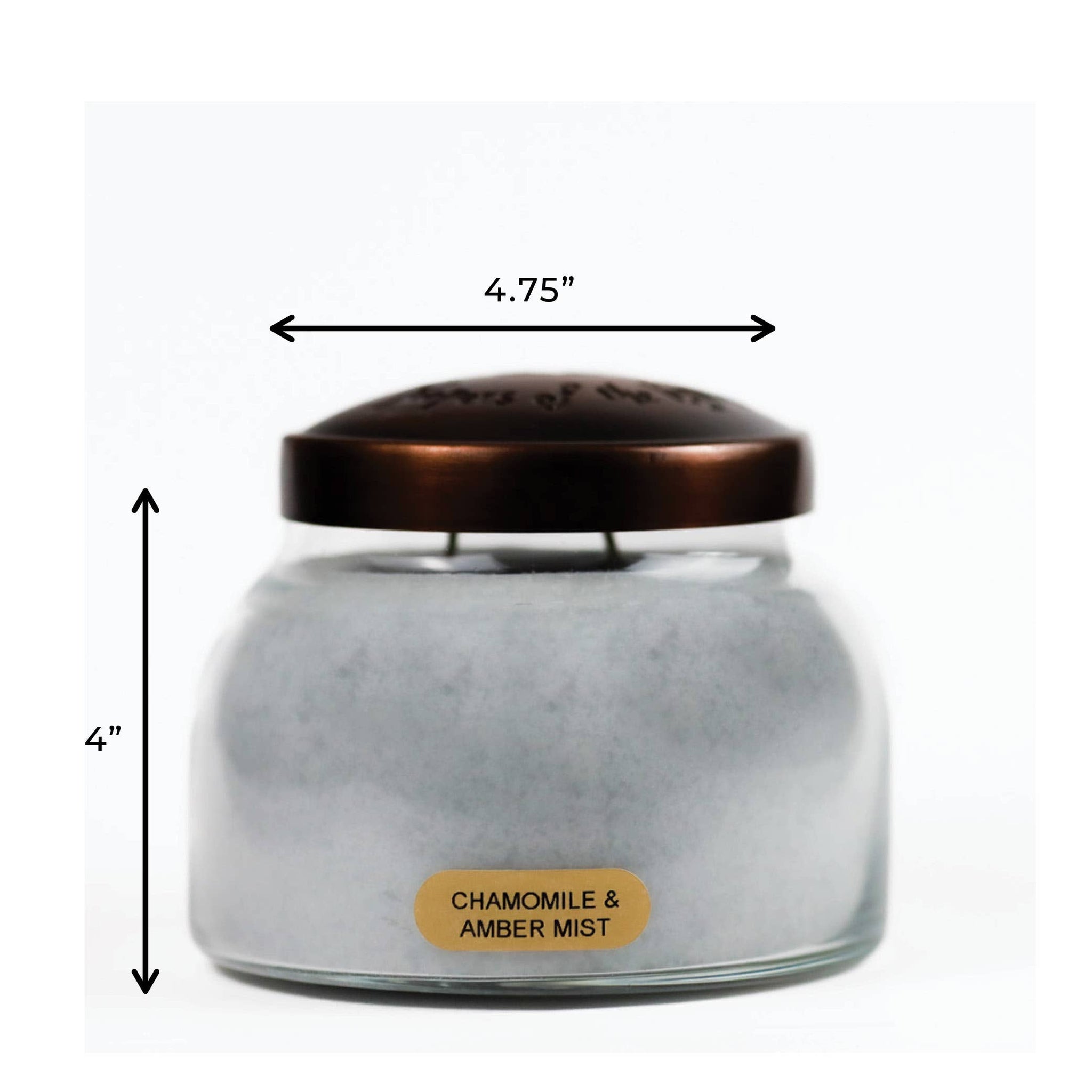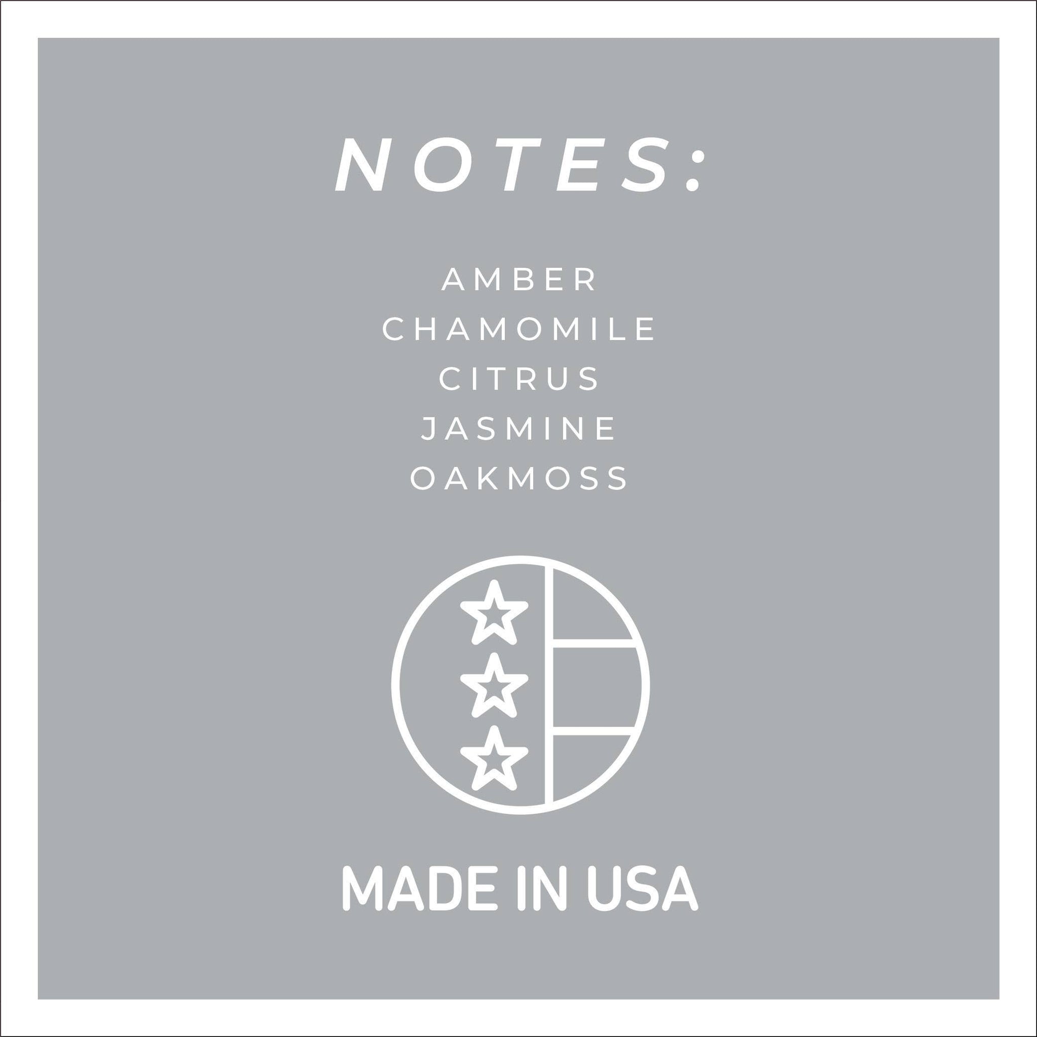 The calming, herbal sweetness of chamomile infused with amber, jasmine & oakmoss. 22oz / Double Wick / Burn Time: 125 hours Dimension: 4.”75w x 4h Available options: Black Lid or Copper Lid