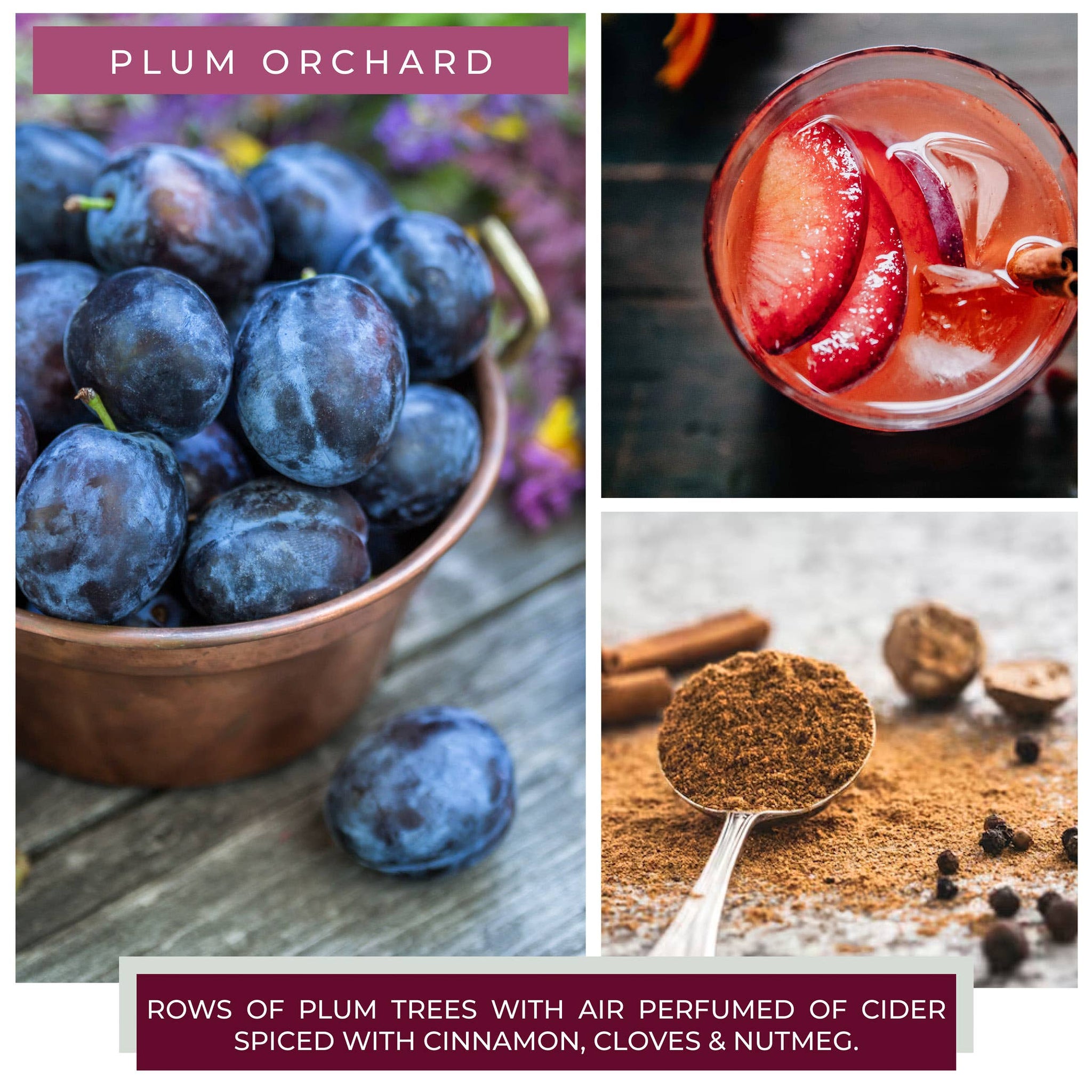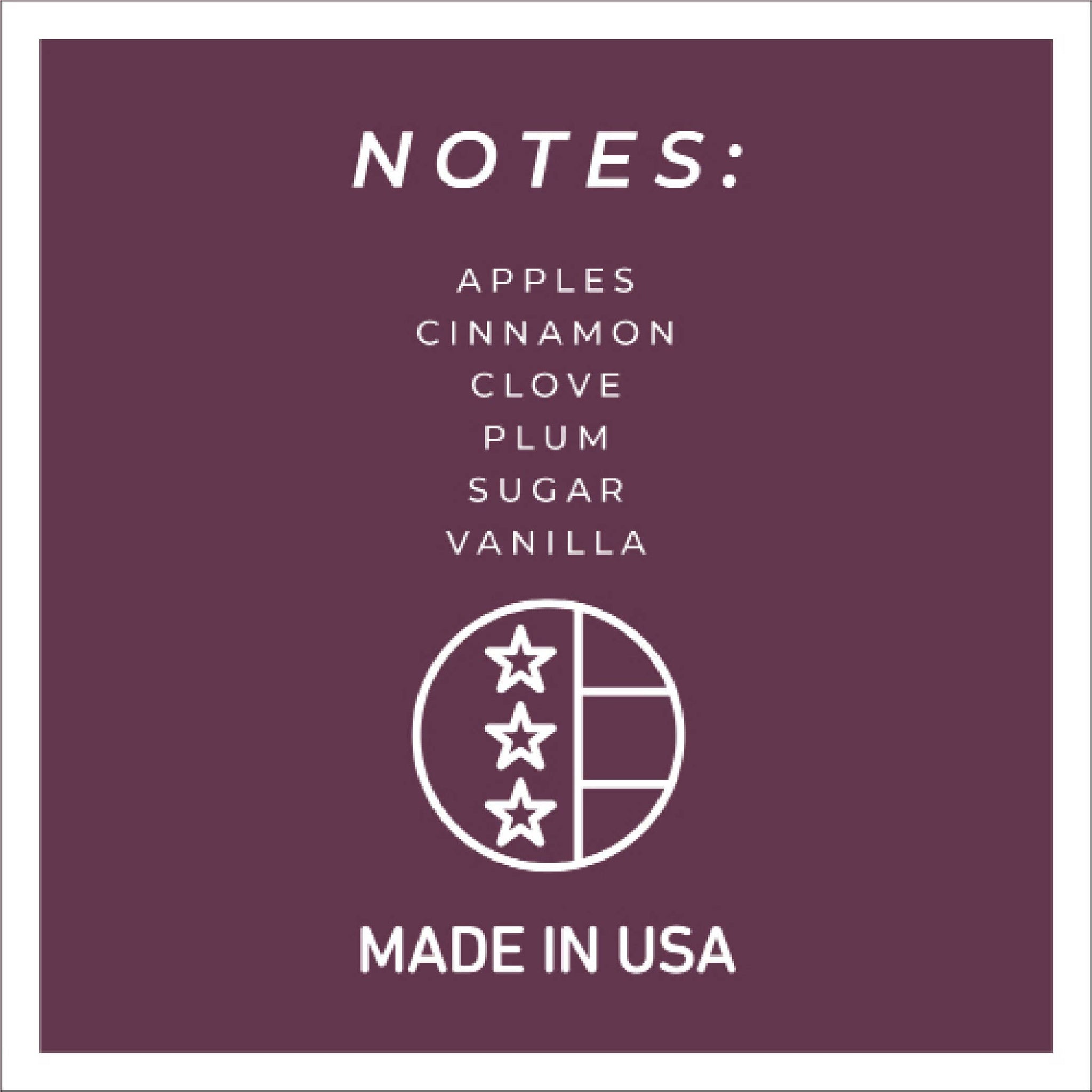 Rows of plum trees sprawled across rolling hills with air perfumed of cider spiced with cinnamon, cloves & nutmeg. 22oz / Double Wick / Burn Time: 125 hours Dimension: 4.”75w x 4h Available options: Black Lid or Copper Lid