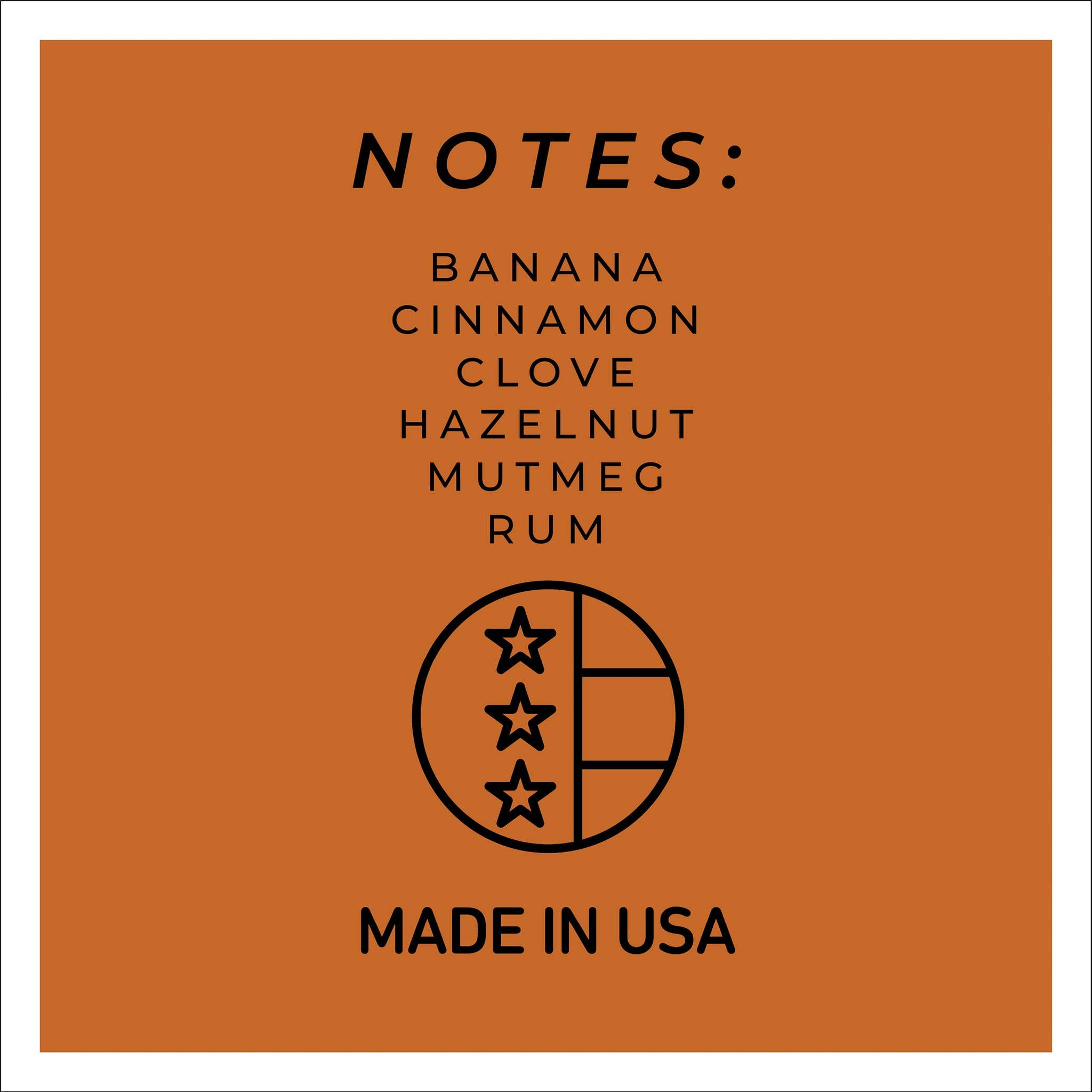 An enticing blend of banana rum, cinnamon, clove, nutmeg & hazelnut. 34oz / Double Wick / Burn Time: 150 hours Dimension: 4.”75w x 5.5h Available options: Black Lid or Copper Lid