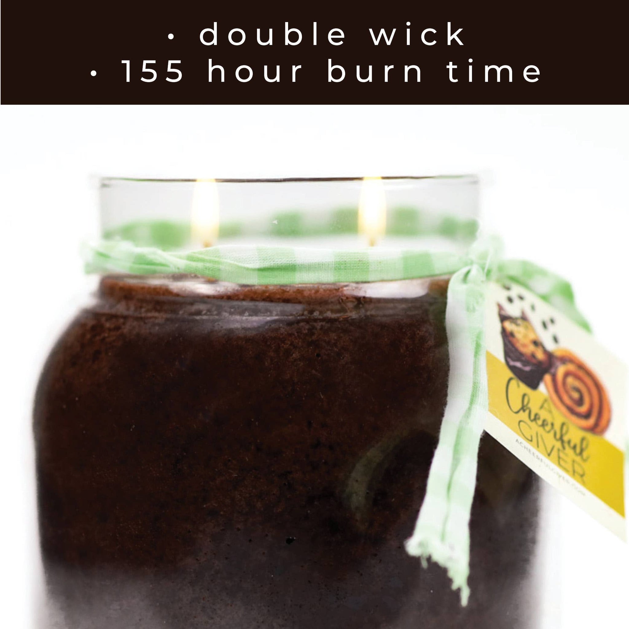 Fresh brewed coffee, cocoa beans, creamy vanilla & sweet caramel. 34oz / Double Wick / Burn Time: 150 hours Dimension: 4.”75w x 5.5h Available options: Black Lid or Copper Lid