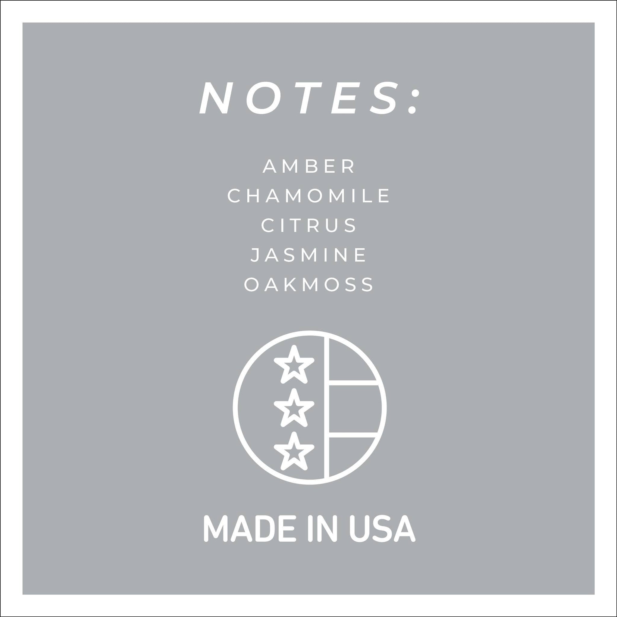 The calming, herbal sweetness of chamomile infused with amber, jasmine & oakmoss. 34oz / Double Wick / Burn Time: 150 hours Dimension: 4.”75w x 5.5h Available options: Black Lid or Copper Lid