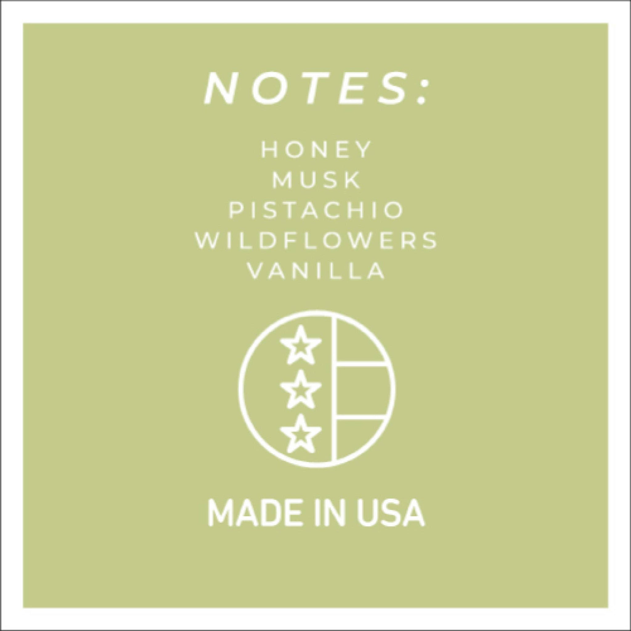 Savor the enticing aroma of toasted pistachios, warm wildflower honey & alluring golden vanilla musk. 34oz / Double Wick / Burn Time: 150 hours Dimension: 4.”75w x 5.5h Available options: Black Lid or Copper Lid