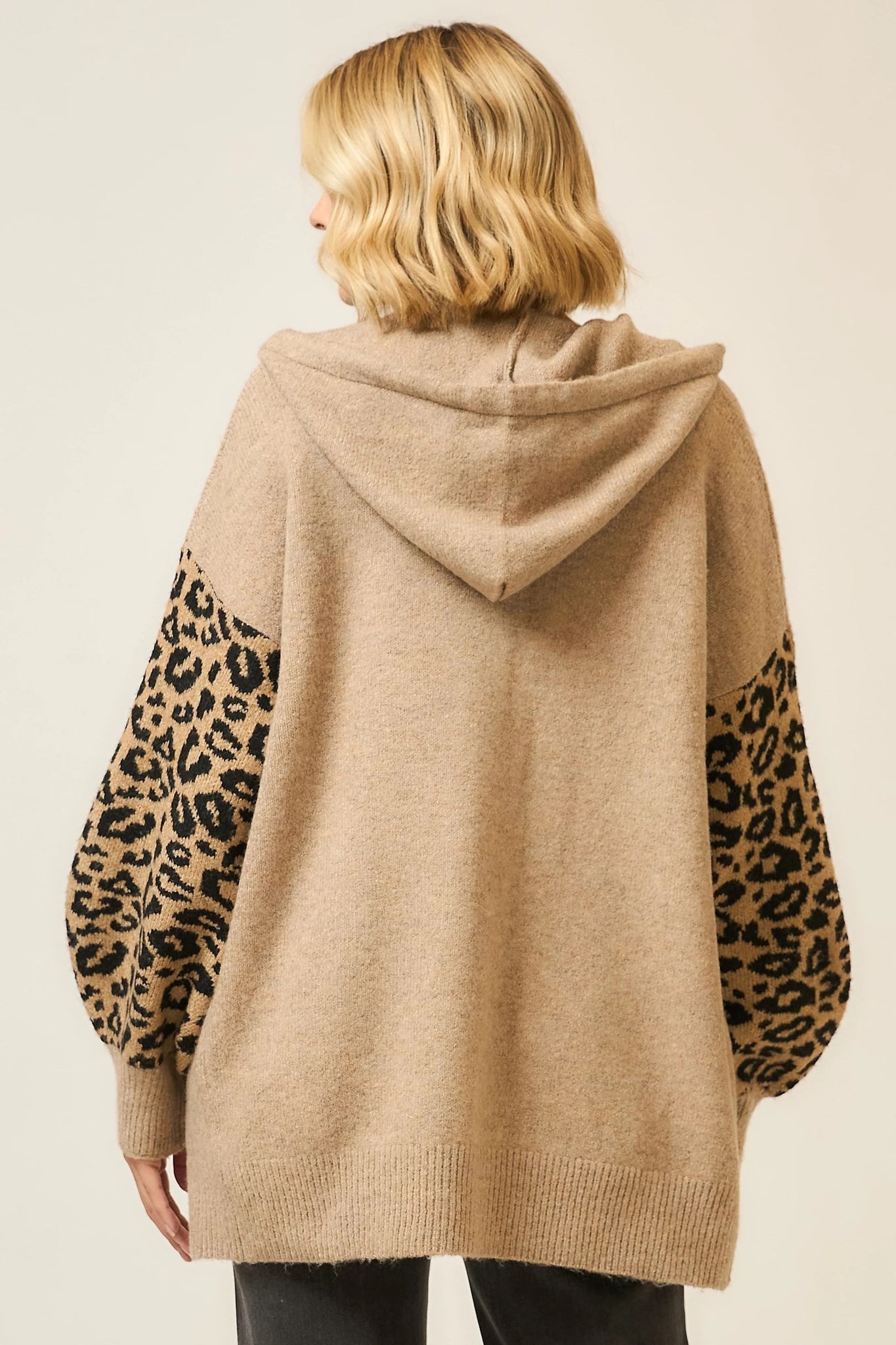 Hooded cardigan with bold leopard print contrast and practical pockets. Soft knit blend with relaxed fit for everyday chic.