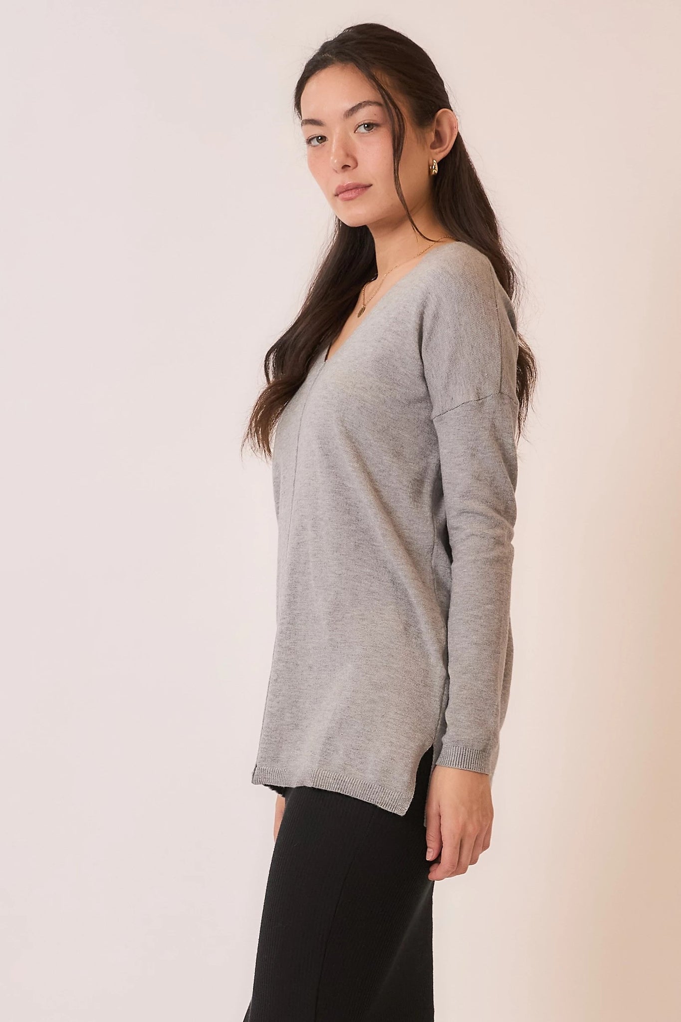 Lightweight fine knit V-neck sweater with exposed seam details. Soft viscose blend for comfort and easy styling.