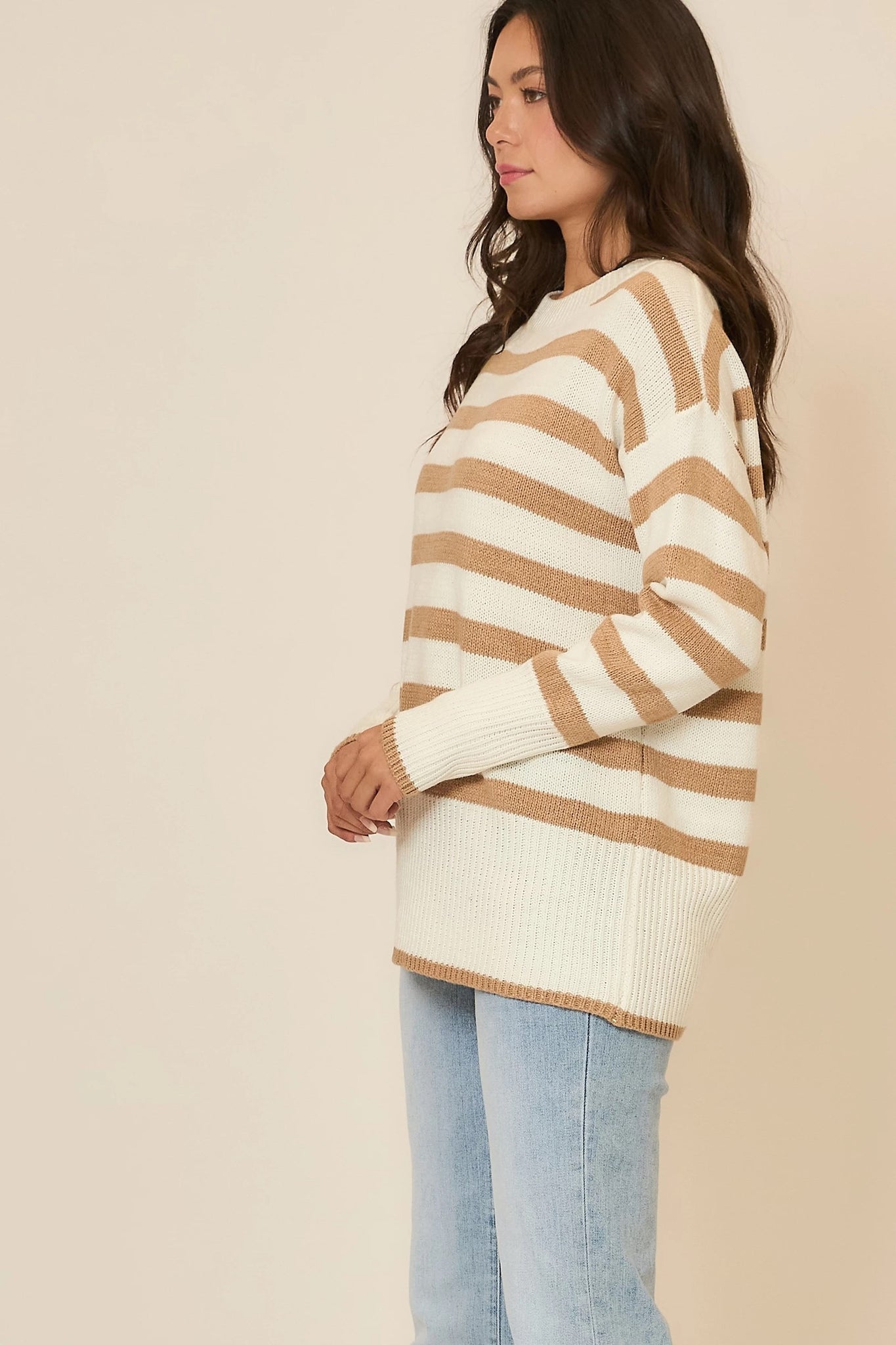 Striped tunic-length sweater in soft acrylic knit. Relaxed fit and extra coverage make it perfect for pairing with leggings or jeans.