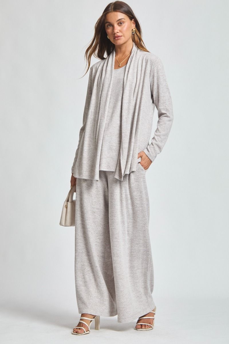 The lightweight, cozy fabric drapes beautifully, keeping you polished from morning coffee to evening plans. The cardigan is the perfect layering piece, while the top features a relaxed, flowy fit with side slits for easy movement; the matching pants offer a comfortable elastic waist and flattering wide-leg cut.