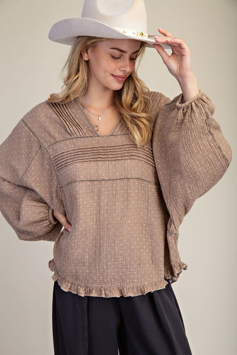 Easel Mocha Polka Dot Washed Cotton Gauze Top | Women’s Long Sleeve Blouse