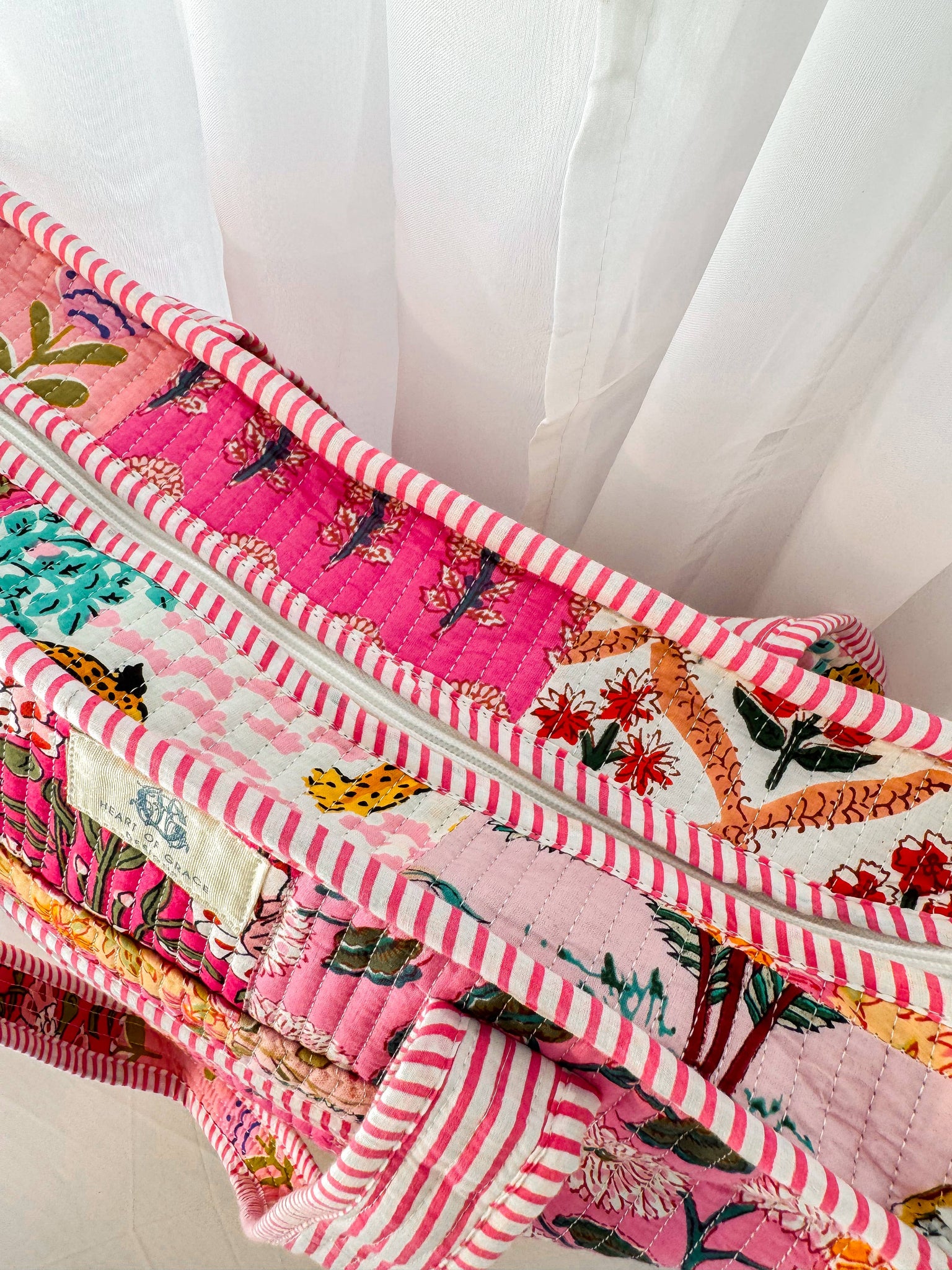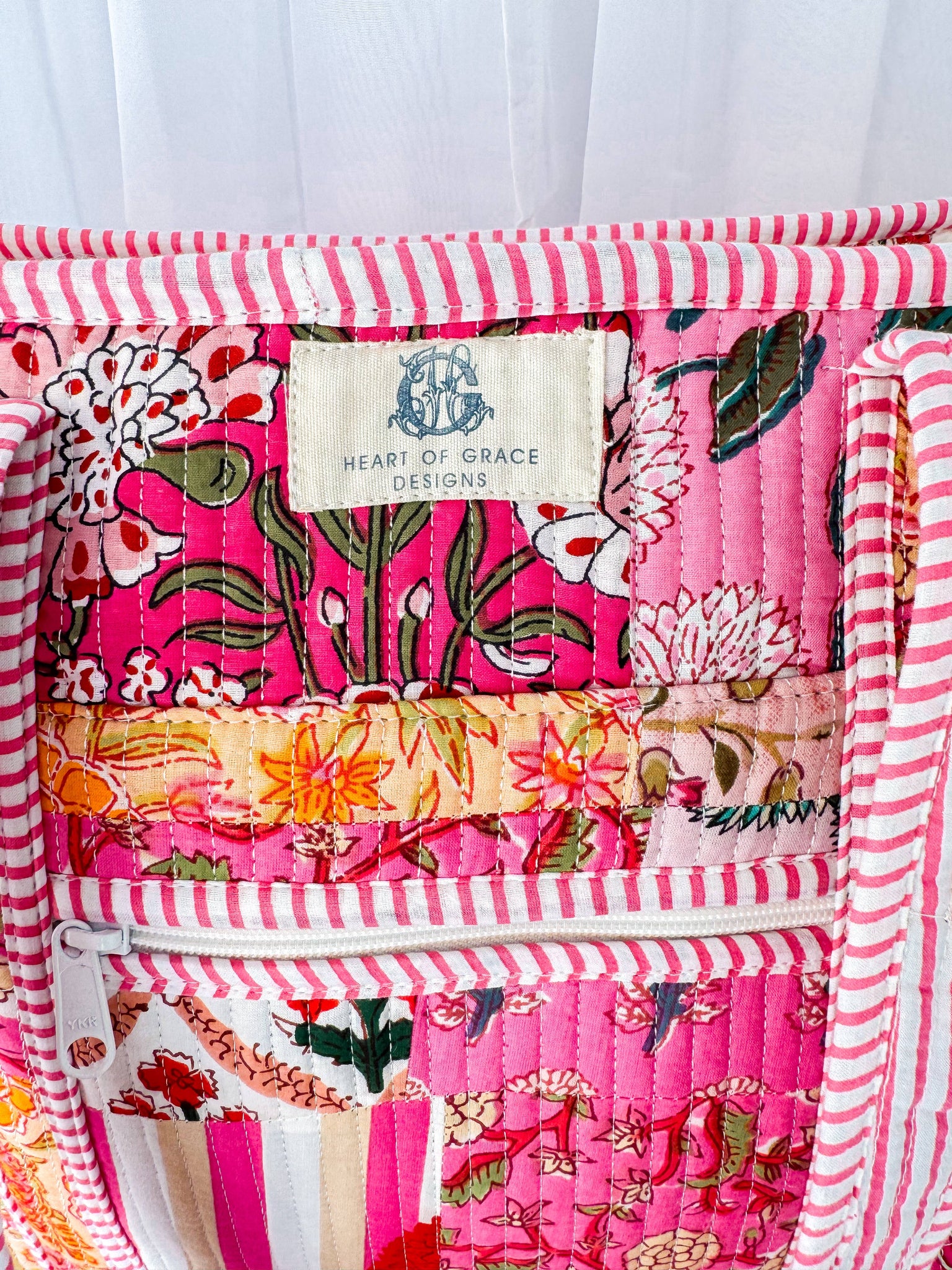 Our Heart of Grace Quilted Tote Collection will be a new customer favorite! These are hand quilted and crafted using block printing and this pattern is inspired by a mixture of our best selling "pink" patterns.