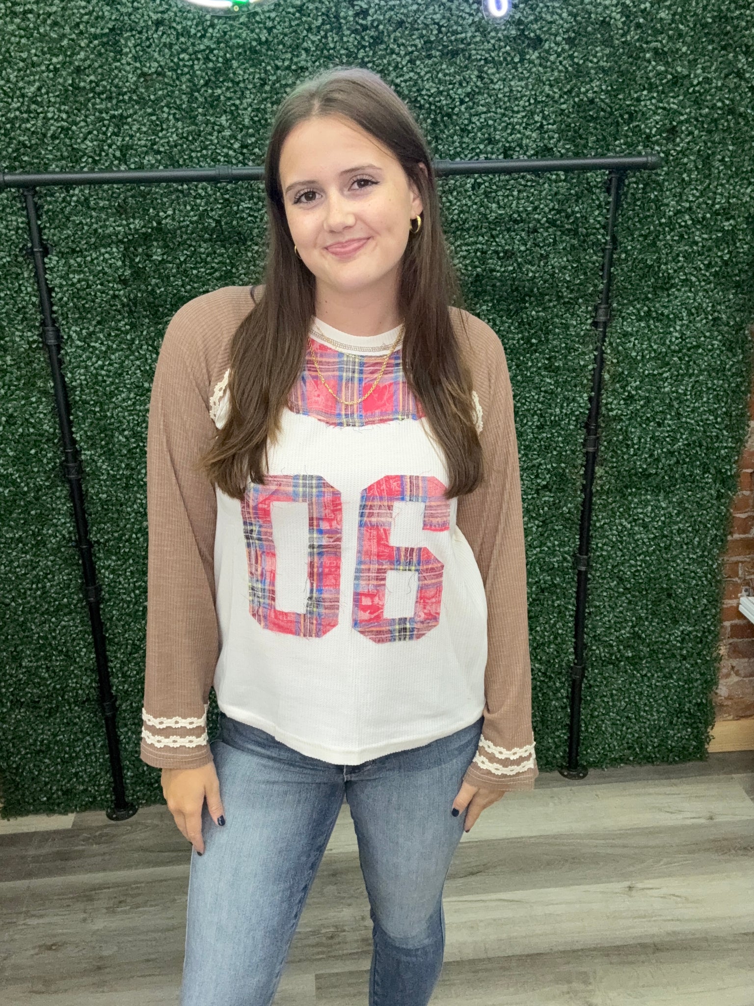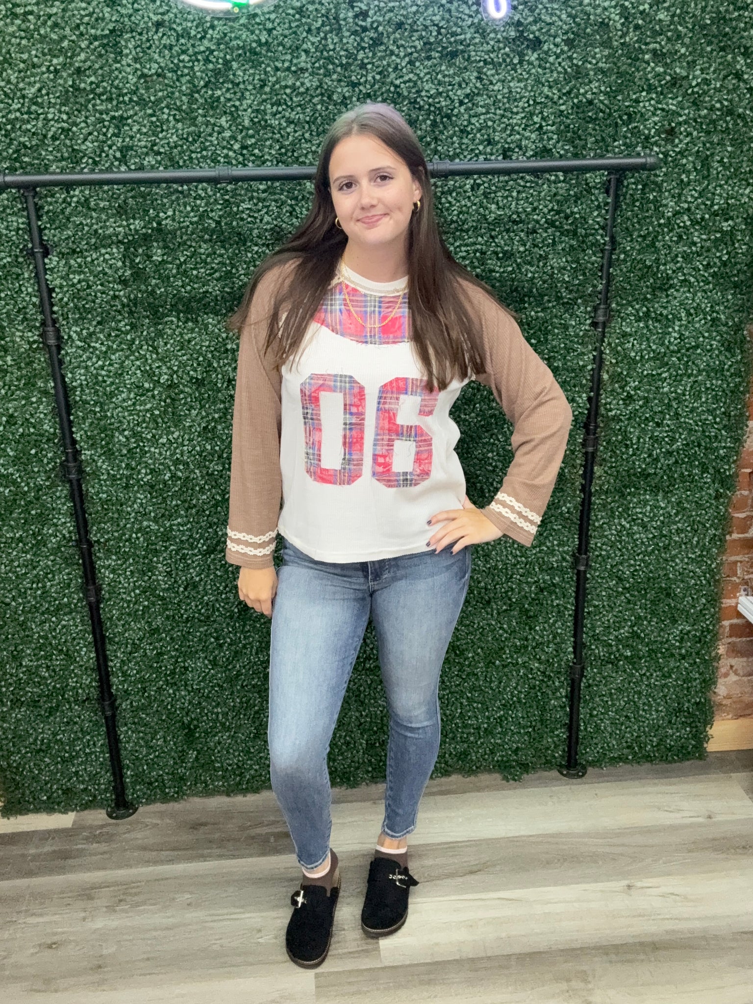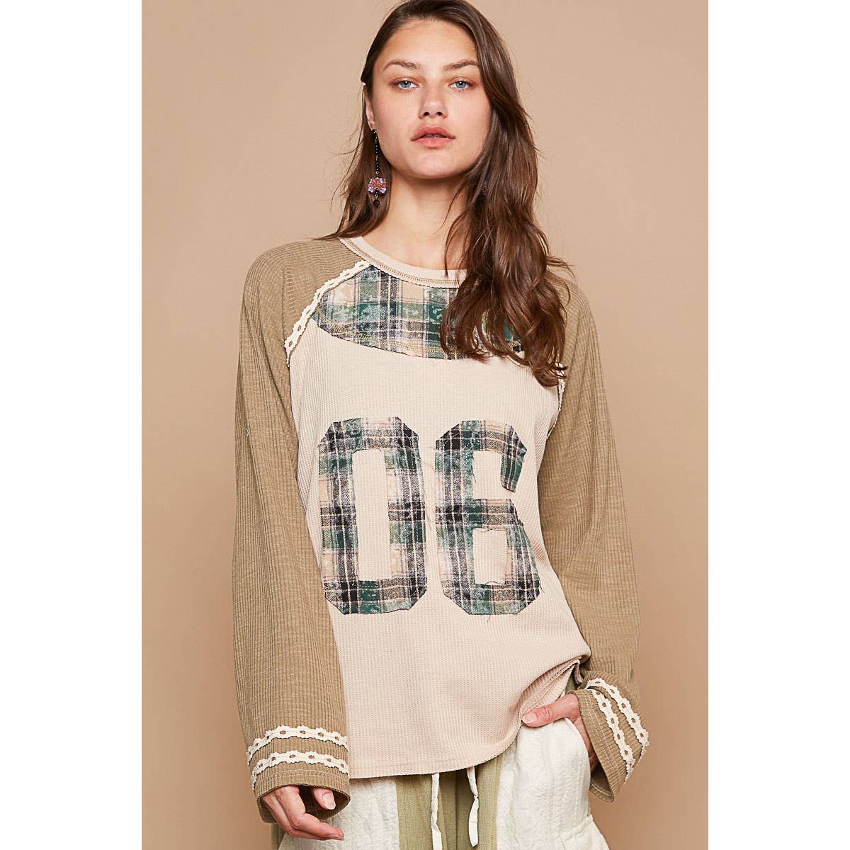 POL Plaid Patch “06” Graphic Raglan Top — Comfy, Cute & Casual