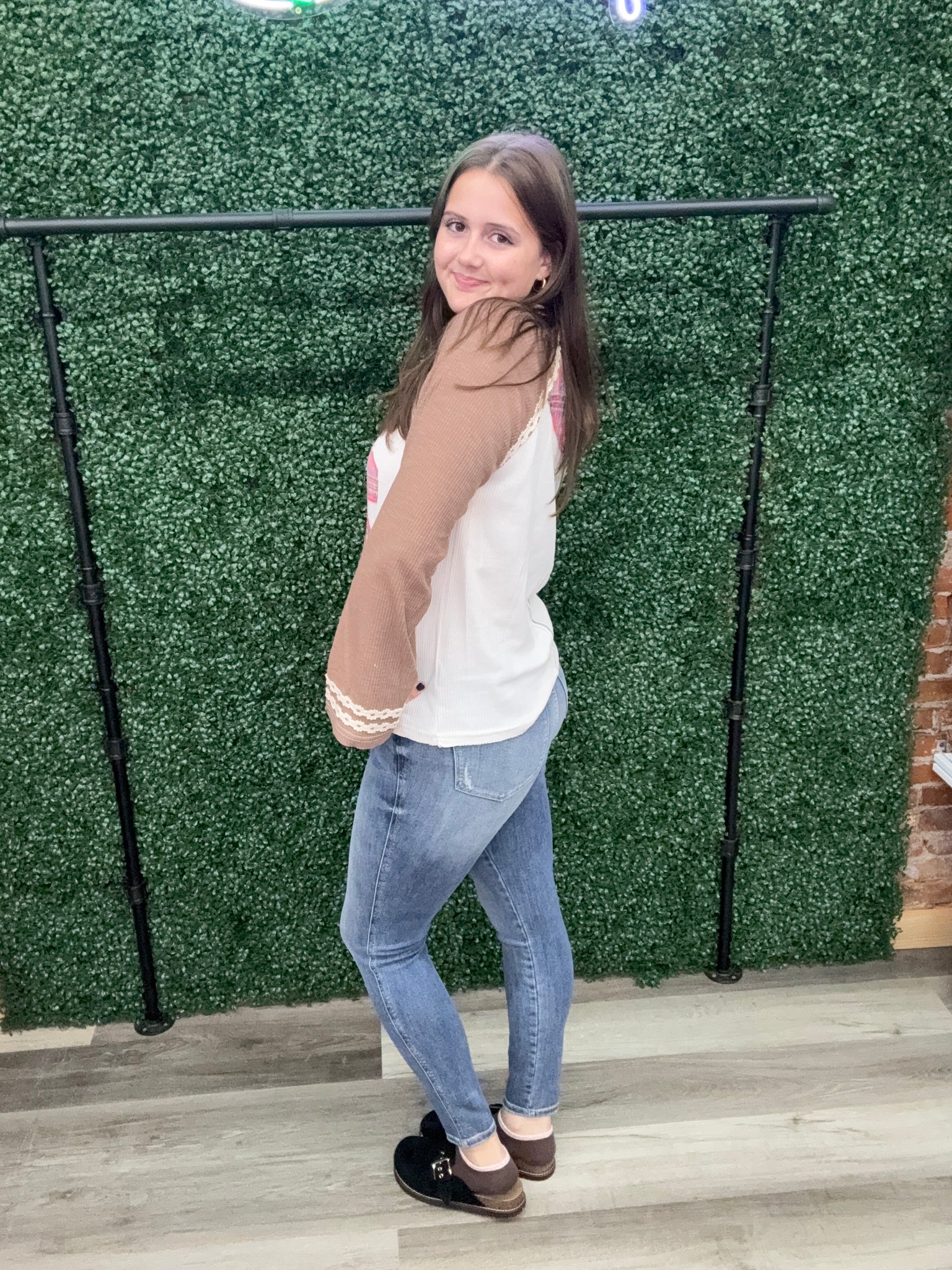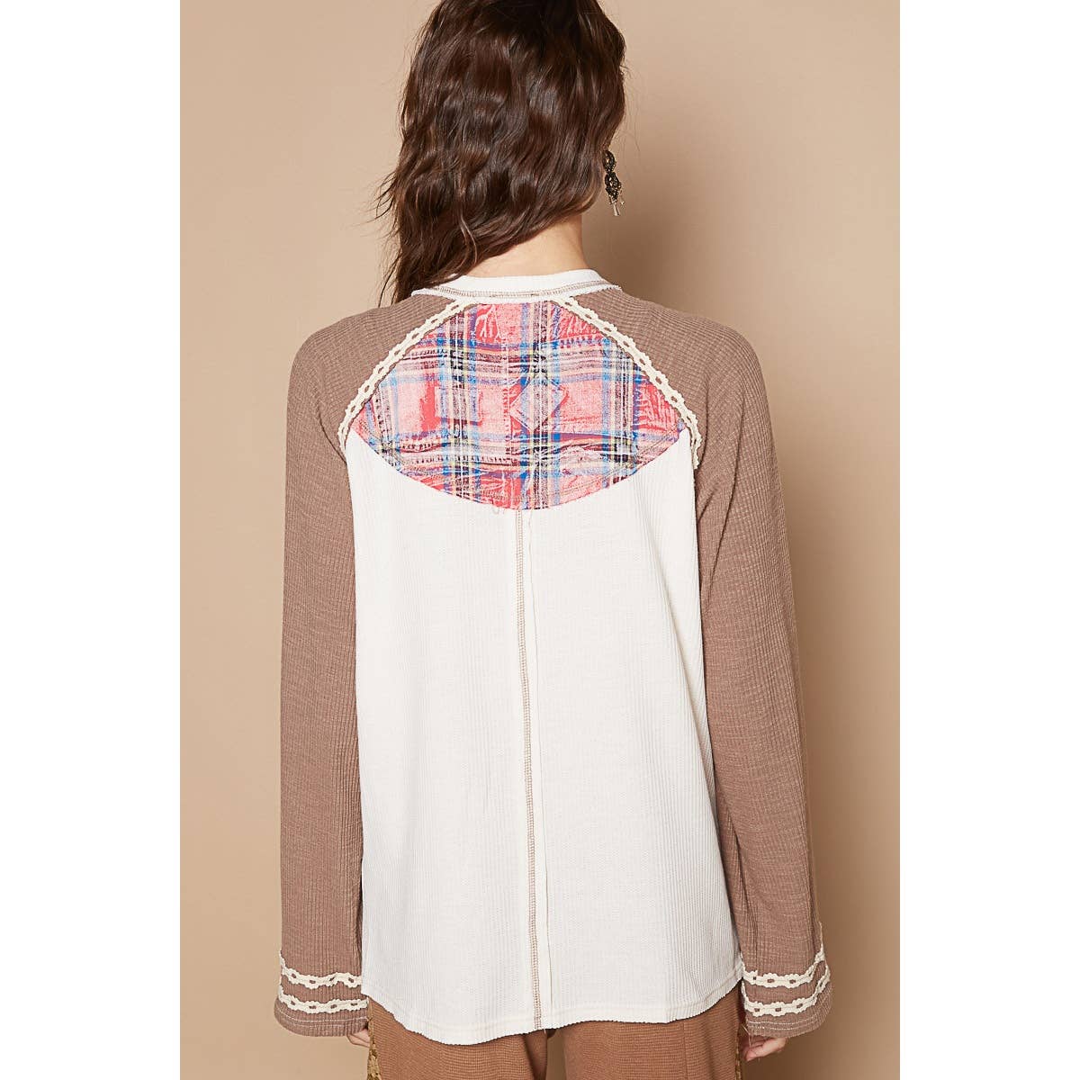 This POL Plaid Patch “06” Raglan Top delivers laid-back comfort with a fun twist. Its soft, neutral-knit body and brown raglan sleeves make it easy to pair with everything from jeans to leggings. The standout feature? A pop of plaid across the neckline and the bold “06” graphic—subtle, playful, and perfectly on trend.